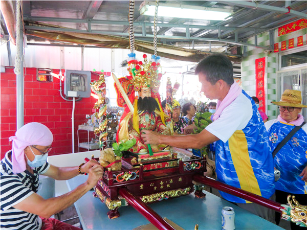 侯王神像在土地爺旁的屋宇安坐一晚,正誕日送回古廟,合心堂成員在起行前為侯王整理衣裝。