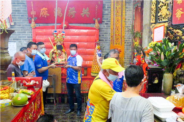 余漢坤(左三)與合心堂成員捧着侯王神像,正準備安放在神台。左二為陳恒鑌。記者鄭玉君攝