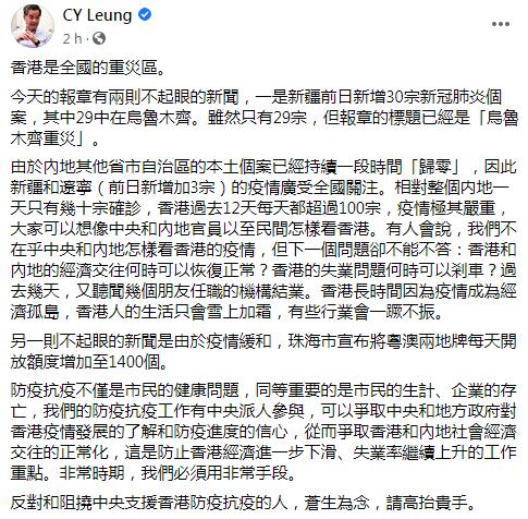 他表示,防疫抗疫工作有中央派人參與,可以爭取中央和地方政府對香港疫情發展的了解和防疫進度的信心,從而爭取香港和內地社會經濟交往的正常化,是防止香港經濟進一步下滑、失業率繼續上升的工作重點,「非常時期,我們必須用非常手段」。