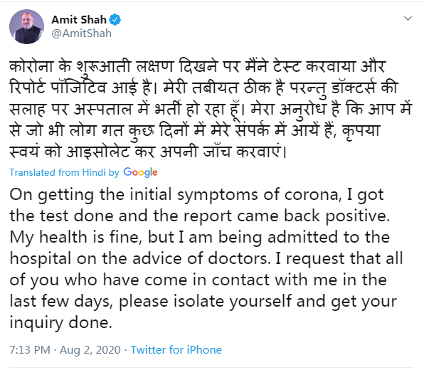 阿米特·沙阿表示,自己在发现出现最初的新冠病毒症状后,自己做了测试,结果呈阳性。自己身体很好,但在医生的建议下,已经住院治疗。建议这几天与自己有过接触的人,可以进行自我隔离并做新冠检测。