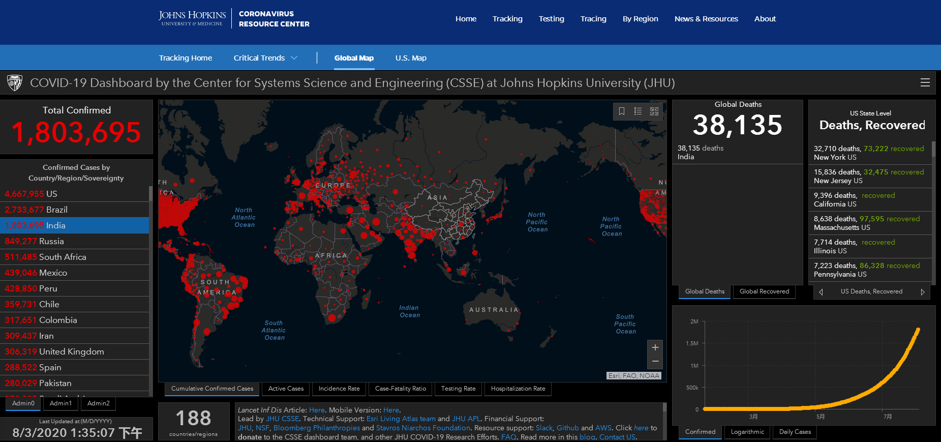 截止香港时间8月3日下午1点35分,印度新冠确诊人数达1,803,695例,死亡人数达38,135例。