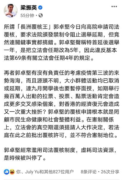 梁振英稱,所謂「長洲覆核王」郭卓堅今日向高院申請司法覆核,要求法院頒發禁制令阻止選舉延期,但竟然連關鍵事實都搞錯。郭卓堅聲稱特首延後選舉一年,是把立法會任期改為5年,因此違反基本法第69條有關立法會任期4年的規定。