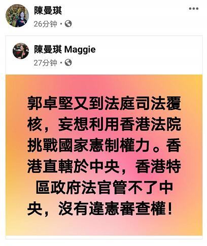 另外,港区全國人大代表陈曼琪也在社交网站发文表示,郭卓堅又到法庭司法覆核,妄想利用香港法院挑战国家宪制权力。她指,香港直辖于中央,香港特区政府法官管不了中央,没有违宪审查权!