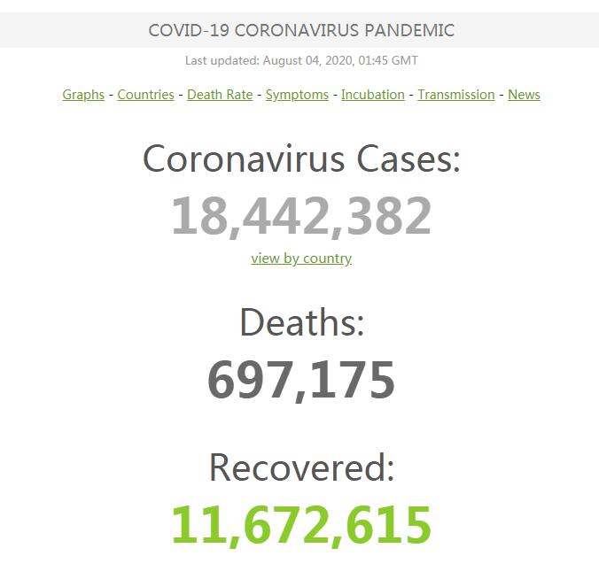 【香港商报网讯】Worldometer网站实时统计数据显示,截至香港时间8月4日9时左右,全球累计确诊新冠肺炎病例超1844万例,累计死亡病例近70万例,82个国家确诊病例超过万例。