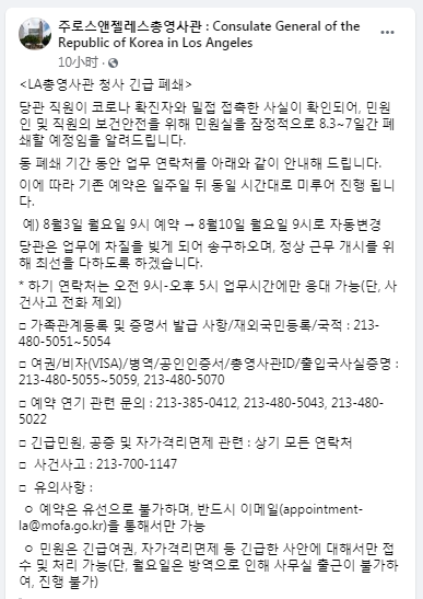 韩国驻洛杉矶总领事馆昨天在Facebook上发布通知,为了保护来访者及工作人员的健康,领事馆将暂时关闭。