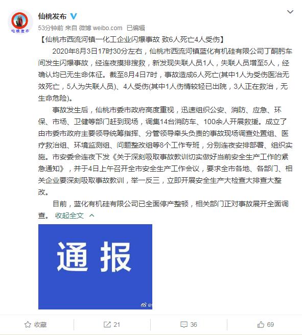 【香港商报网讯】2020年8月3日17时30分左右,湖北仙桃市西流河镇蓝化有机硅有限公司丁酮肟车间发生闪爆事故,经连夜摸排搜救,新发现失联人员1人,失联人员增至5人,经确认均已无生命体征。截至8月4日7时,事故造成6人死亡(其中1人为受伤医治无效死亡,5人为失联人员)、4人受伤(其中1人伤情较轻已出院,3人正在救治,无生命危险)。