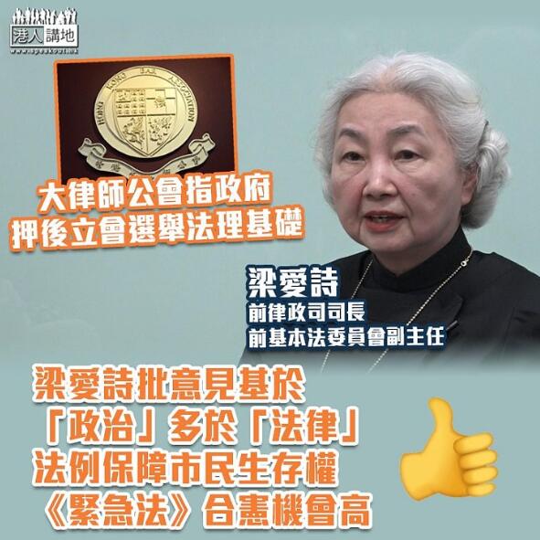 基本法委員會前副主任、前律政司司長梁愛詩反駁大律師公會就政府押後立法會選舉提出的意見,認為公會的說法是基於政治,多於法律理由。她說本港的新冠肺炎疫情,自上個月初起變得極度嚴峻。她不諱言,如選民外出投票,將會有很大的感染風險。她指出,《基本法》和《香港人權法案條例》均保障選舉權和被選權,而同樣的法例亦保障市民的生存權利。她稱政府曾考慮引用《立法會條例》和《預防及控制疾病條例》押後選舉,但立法的過程或會受到反對派議員「拉布」影響,因此並不可行。她指出,雖然《緊急法》的合憲性正受到司法覆核挑戰,但她相信政府在緊急情況下,引用有關法例,被判合憲的機會相當高。