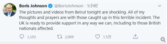 黎巴嫩首都贝鲁特港口区当地时间4日傍晚发生剧烈爆炸,英国首相鲍里斯•约翰逊当晚发推表示震惊,他还表示,英国已准备好提供力所能及的帮助。「今晚,来自贝鲁特的图片和视频令人震惊。」约翰逊发推称:「我所有的思绪与祈祷都与那些被捲入这场可怕事件的人们同在。英国已经准备好提供力所能及的支持,包括对受影响的英国公民。」
