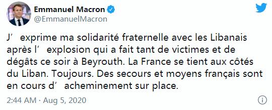 法国总统马克龙发推表达了对黎巴嫩民众的支持,并表示法国正在向黎巴嫩提供援助。马克龙在推特上写道:「今晚贝鲁特发生爆炸,造成很多伤亡及破坏,我向黎巴嫩致以兄弟般的声援。法国与黎巴嫩同在,一直如此。法国的援助和资源正在运往(爆炸)地点。」