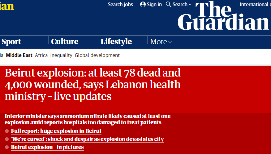 当地时间4日18时左右,黎巴嫩首都贝鲁港口区发生大爆炸。综合美国有线电视新闻网(CNN)、英国《卫报》消息,黎巴嫩卫生部长表示,贝鲁特爆炸目前已致至少有78人死亡、4000人受伤。