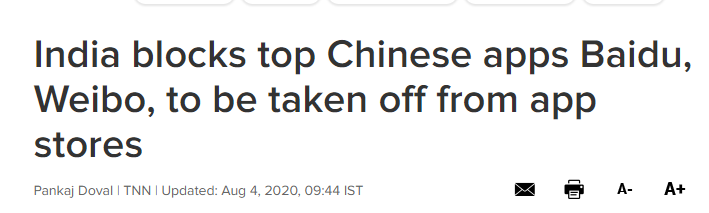 此前,在6月29日晚,印度电子信息技术部宣布,禁止包括TikTok和微信在内的59款中国应用。百度则是在7月27日新增的47个被禁应用程序名单中。
