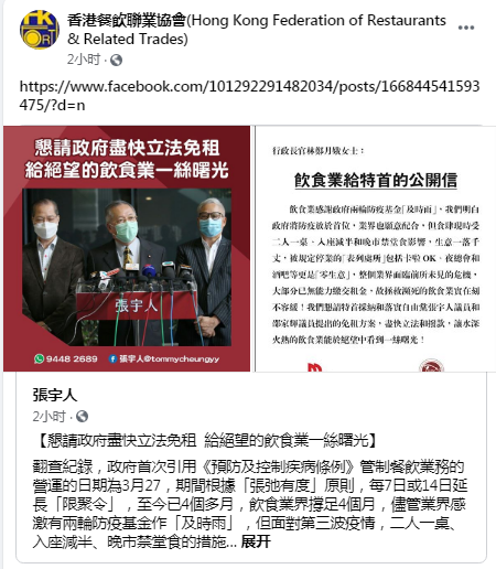 6個飲食業協會在公開信中提到,現時業界面臨前所未見的危機,接近「瀕死」狀態。2人一桌、入座減半、禁晚市堂食等措施令業界生意一落千丈,而卡啦OK、夜總會、酒吧等表列處所因停業更零生意,大部分無力交租。業界懇請政府接納早前有議員提出的免租方案,盡快立法與撥款。