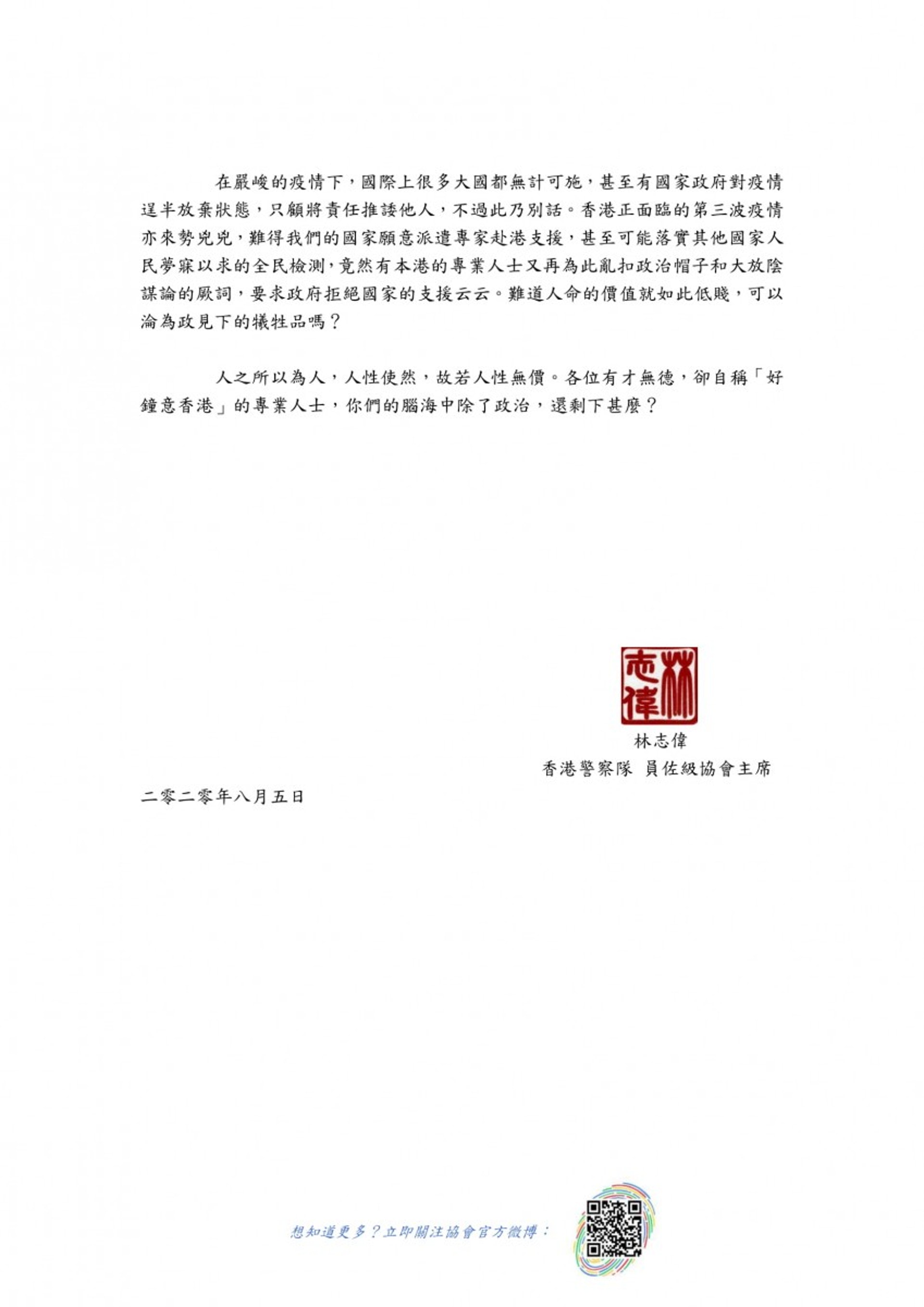 林志偉又形容,香港第三波疫情來勢洶洶,中央願意派遣專家赴港支援,甚至有可能落實全民檢測。而本港卻有專業人士亂扣「政治帽子」,大放厥詞要求政府拒絕國家的支援云云。他直言:「難道人命的價值就如此低賤,可以淪為政見下的犧牲品嗎?」,又反問該批「好鐘意香港」的專業人士:「腦海中除了政治,還剩下甚麼?」