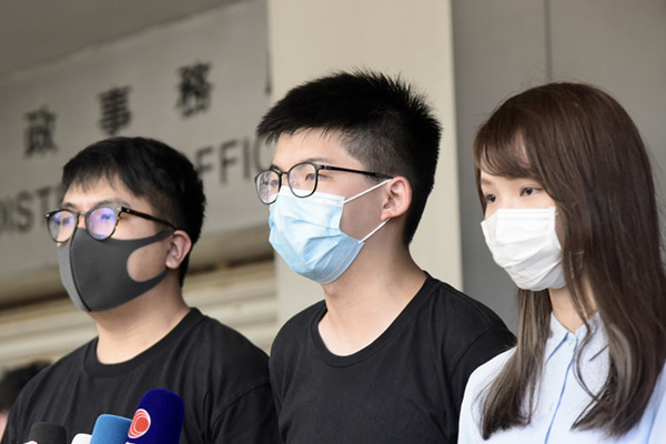 「香港眾志」前主席林朗彥(左)、前秘書長黃之鋒(中)及前成員周庭(右)。 香港中通社資料圖