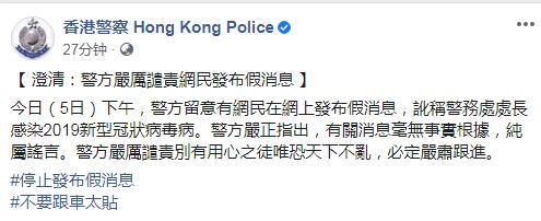 【香港商报网讯】对於有谣言称香港警务处处长感染新型冠状病毒,香港警方在官方FB上辟谣,严厉谴责别有用心之徒唯恐天下不乱。