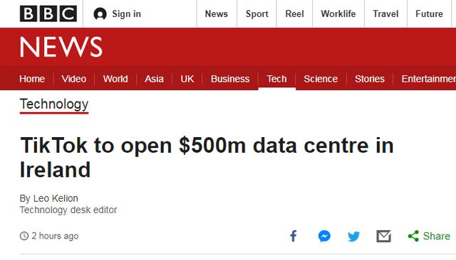 从报道来看,TikTok已经宣布了建设他们欧洲首个数据中心的消息,将建在爱尔兰,投资4.2亿欧元,折合约5亿美元。