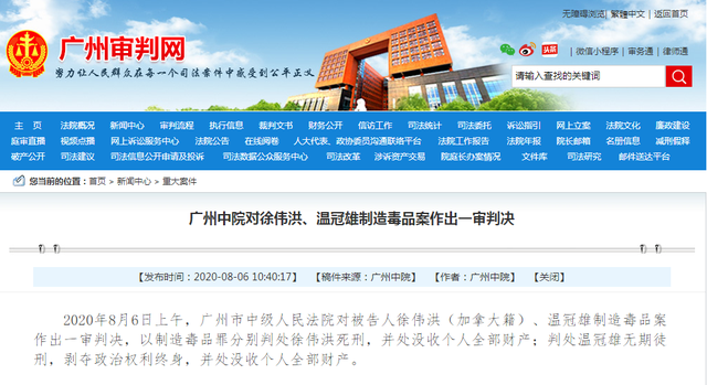 【香港商报网讯】8月6日上午,广东省广州市中级人民法院对被告人徐伟洪(加拿大籍)、温冠雄制造毒品案作出一审判决,以制造毒品罪分别判处徐伟洪死刑,并处没收个人全部财产;判处温冠雄无期徒刑,剥夺政治权利终身,并处没收个人全部财产。