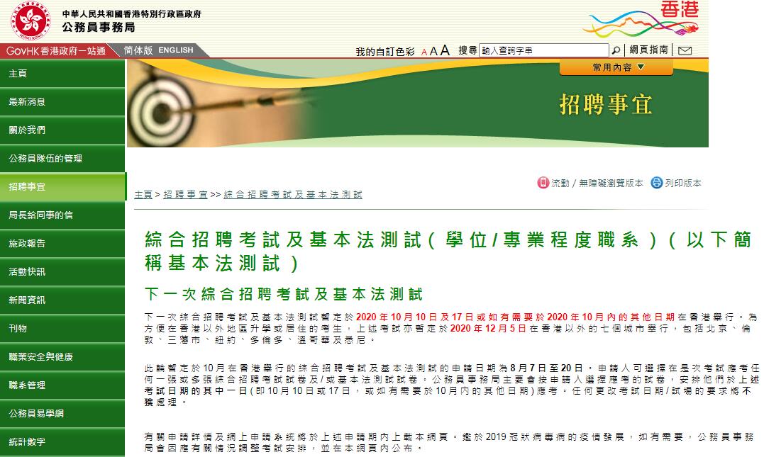 政府又指,2020至21年度政務主任、二級行政主任、二級助理貿易主任及二級運輸主任職位的招聘詳情,將於9月另作公布。任何人士申請有關職位時,不會被自動安排參加綜合招聘考試。因此,如尚未具備所需的綜合招聘考試成績(或同等成績),或有意應考基本法測試,則必須在上述申請時間內報考綜合招聘考試及/或基本法測試。所有綜合招聘考試及/或基本法測試的申請人只能選擇在香港或上述香港以外的其中一個城市(即北京及六個海外城市)應考。