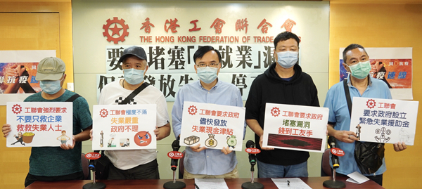 工聯會提出多項建議,其中包括當局即時發放為期6個月的9000元「失業現金津貼」。該會按7月公布的24萬失業人士計算,估計開支大約130億元。該會進一步指出,當局針對受停工影響僱員,應向他們發放「停工津貼」,而且要直接發放到僱員手中;又建議政府長遠而言要設立「緊急失業援助金」,有關援助金是不論兼職或全職僱員,只要在申請前受僱滿6個月及通過資產審查,一旦失業並以工資中位數八成計算,可以獲發放最高每月1.5萬元。
