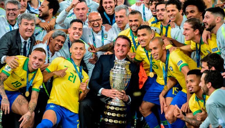 图为博尔索纳罗在2019年7月巴西队赢得美洲杯冠军时与球员们共同庆祝。