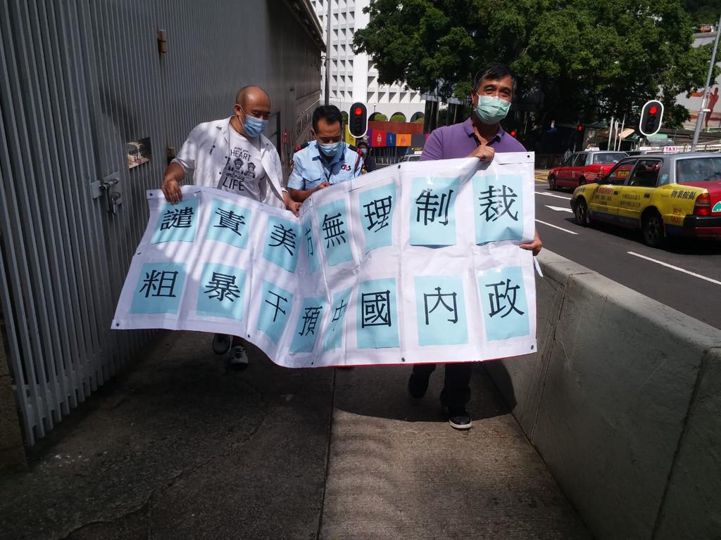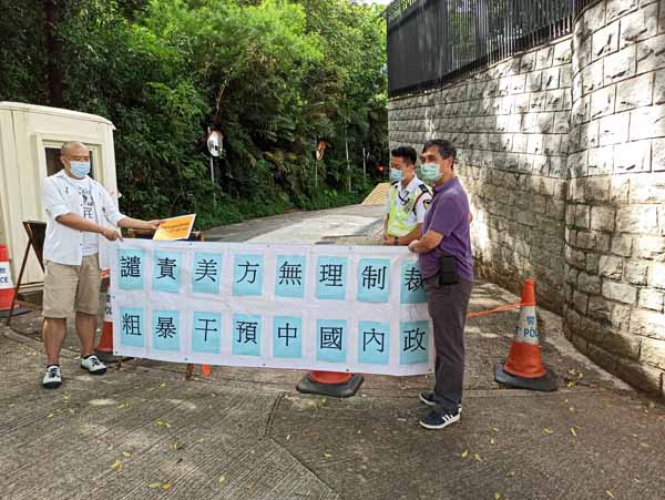 8月9日下午,香港教育工作者聯會黃大仙地區辦事處來到美國駐港總領事館門口請願,強烈抗議美國制裁多名中國官員,並要求美國財長史蒂芬·姆努欽道歉和下台。(香港中通社記者 林東蔚 攝)