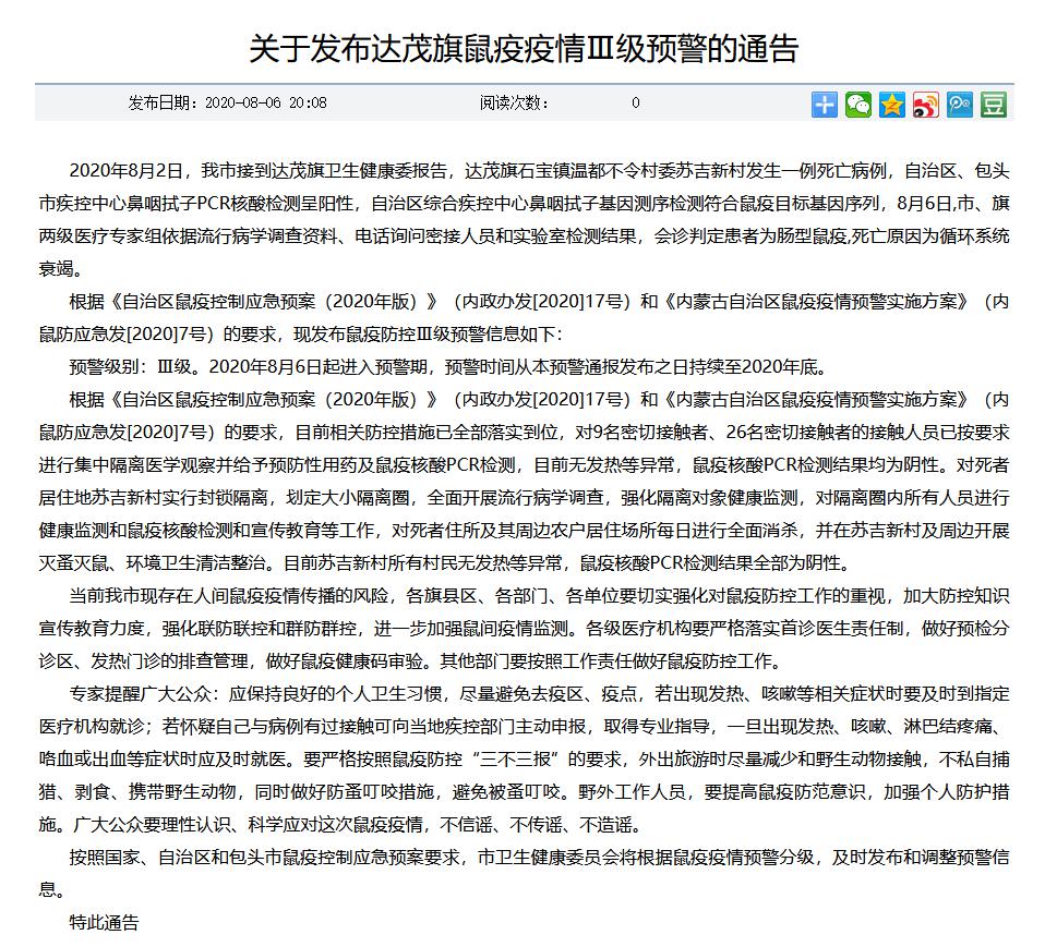 此前,包头市卫健委发布达茂旗鼠疫疫情Ⅲ级预警,达茂旗立即启动鼠疫疫情Ⅳ级应急响应。