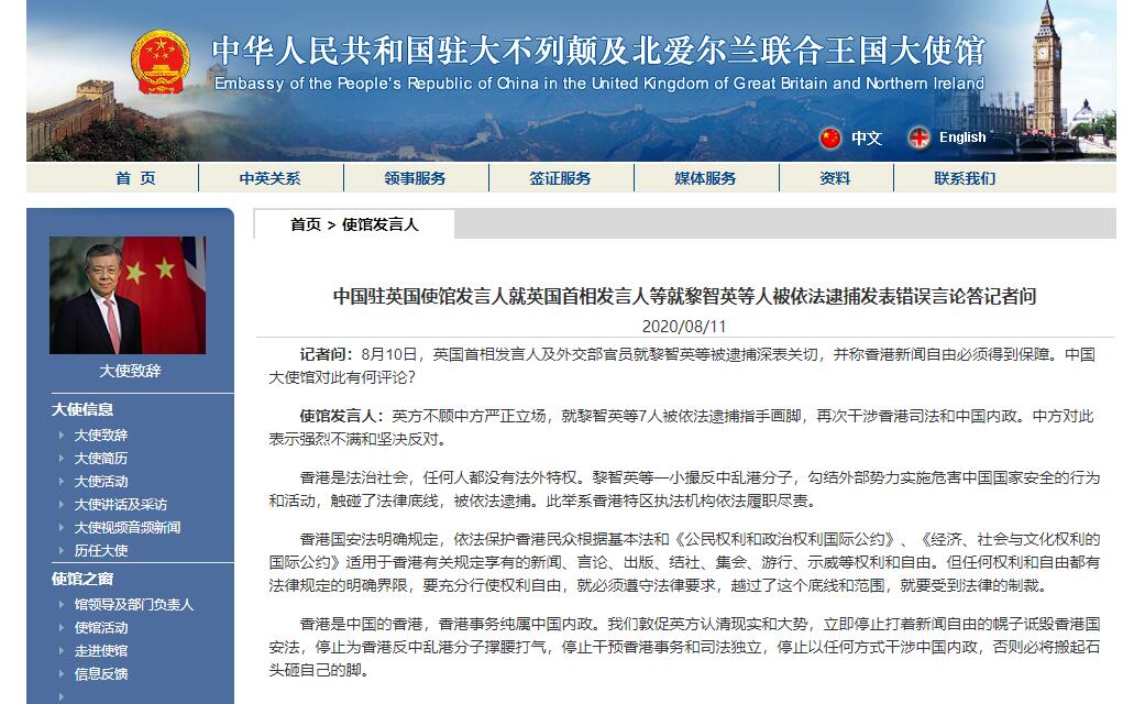 记者问:8月10日,英国首相发言人及外交部官员就黎智英等被逮捕深表关切,并称香港新闻自由必须得到保障。中国大使馆对此有何评论?