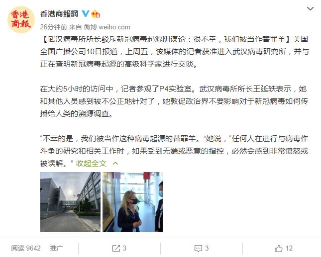 在大约5小时的访问中,记者参观了P4实验室。武汉病毒所所长王延轶表示,她和其他人员感到被不公正地针对了,她敦促政治界不要影响对于新冠病毒如何传播给人类的溯源调查。