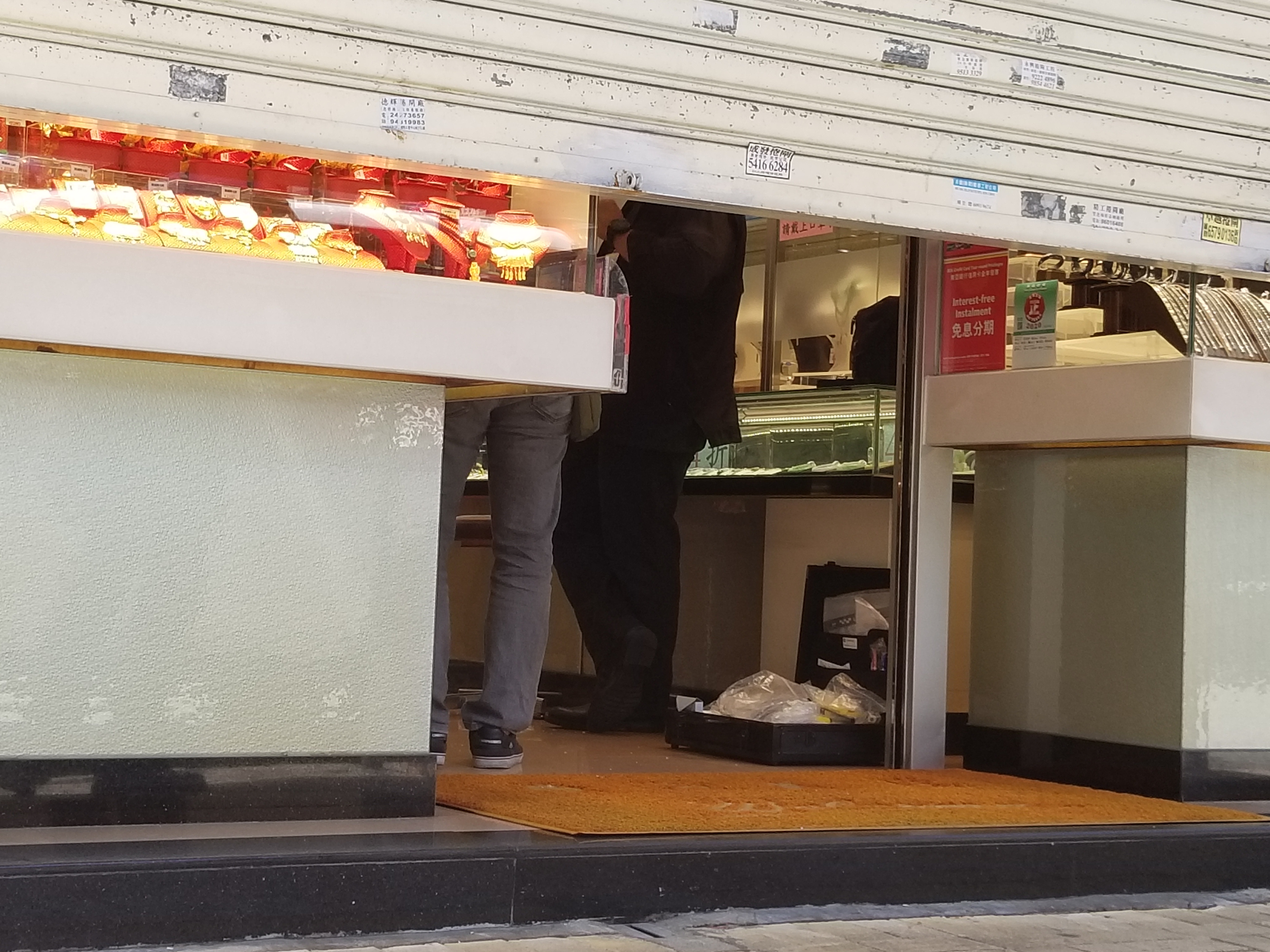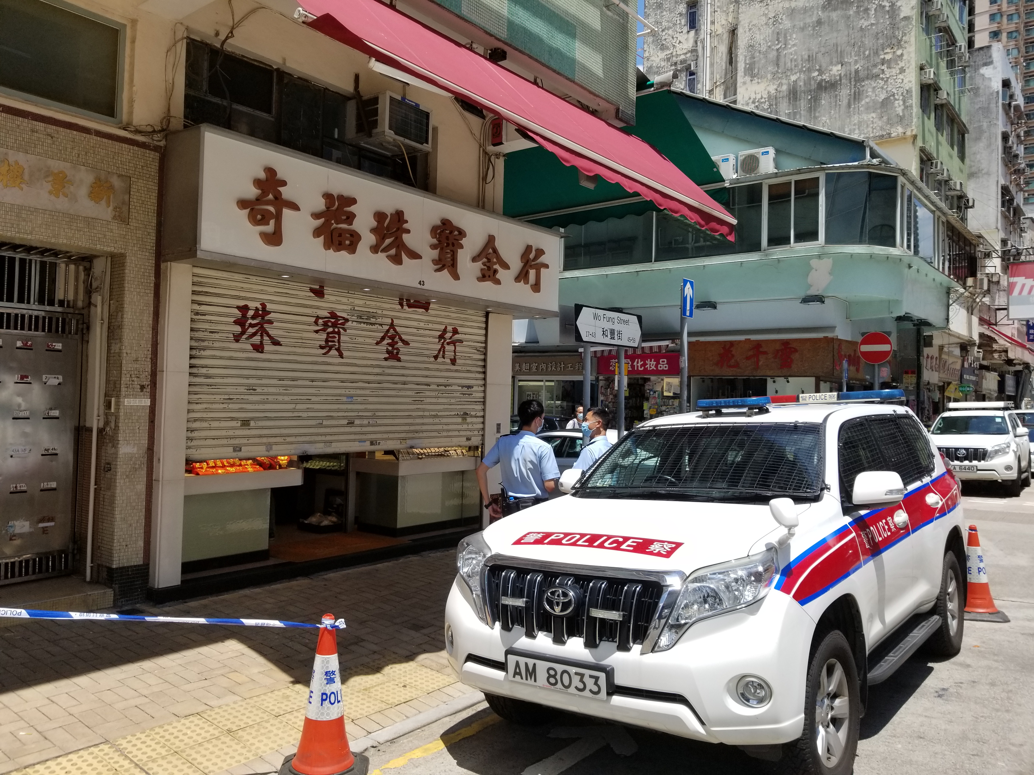 兩名黑衣人今晨9時許,持刀和鐵鎚闖進粉嶺和豐街43號地下1間金行,不由分說揮舞長柄鐵鎚,猛擊玻璃飾櫃,不足半分鍾即擊破飾櫃,掠去多盤金飾後,登上接應私家車逃去,過程僅約1.5分鍾。金行內2名職員不敢妄動,蹲下躲在另一邊的飾櫃下,待賊人離去後慌忙報警。