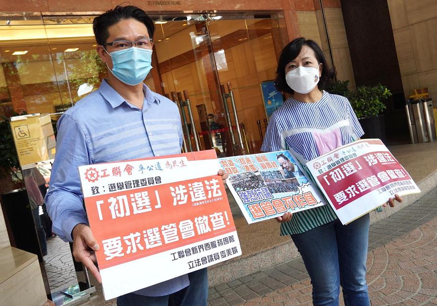 工聯會立法會議員麥美娟聯同工聯會社區主任梁子穎今日到選舉管理委員會請願,要求選管會徹查反對派的所謂「初選」,涉違反《選舉(舞弊及非法行為)條例》,並要求政制及內地事務局責成選管會嚴肅跟進事件。他們指,反對派舉辦的所謂「初選」從而達至奪權、奪港,擾亂香港,威脅國家安全,認為他們上述行為涉影響選舉公平性、公然挑戰《國家安全法》的違法行為。