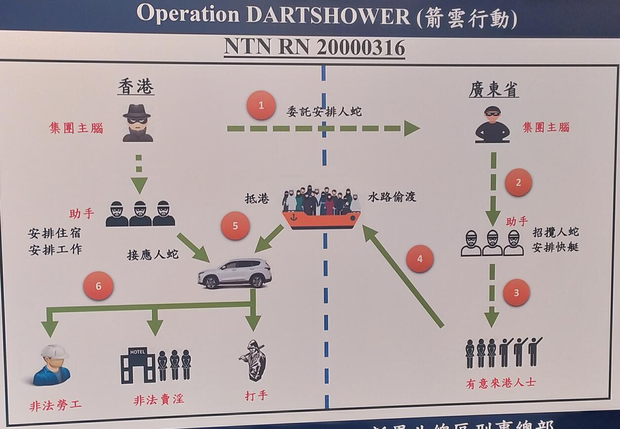 當局經深入調查和情報分析,鎖定一個跨境犯罪集團,並發現該集團透過在廣東省的接頭人,利用網上社交平台招募有意來港工作人士,收取每人5000元至1.5萬元人民幣,通常選擇在深夜時分,利用經過改裝配備3個大馬力馬達的快艇進行偷渡,主要集中從珠海來港,登陸地點則在香港西面即東涌或屯門一帶海岸,人蛇抵港後集團會安排他們入住酒店及工作,如地盤、回收工場及賣淫,並會在非法入境者中挑選體格健碩的人士參與黑社會違法活動。