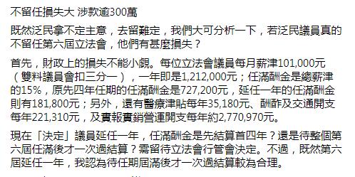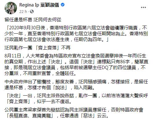 全國人大常委會早前決定第六屆立法會繼續履行職責不少於1年,部分民主派議員主張以民意調查結果決定延任與否。立法會議員葉劉淑儀发文指,泛民不延任會帶來重大損失,估計每名議員涉款514萬港元。若果全體非建制派議員拒絕延任,共涉及近1.2億港元公帑。身兼新民黨主席的葉劉淑儀更嘲泛民主派「各說各話,亂作一團」,以往主張的「齊上齊落」似乎已經一去不返。