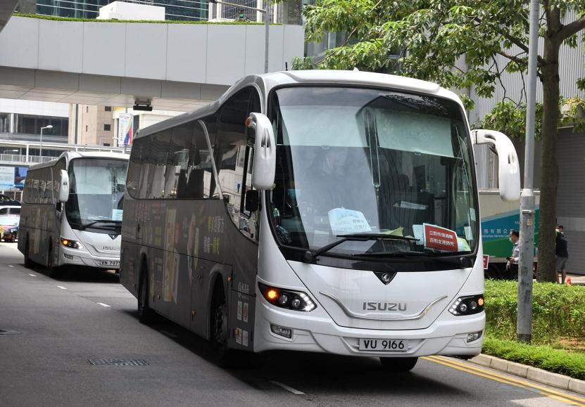今早數十部旅遊巴由中環摩天輪出發慢駛至政府總部,支持政府推行普及社區檢測。蔡啟文攝