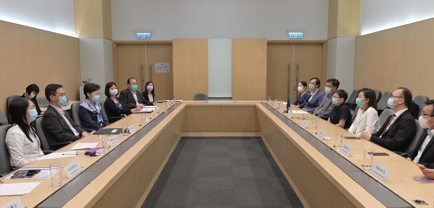 教育局局長楊潤雄(左二)及常任秘書長李美嫦(左四)今日(27日)下午與中小學議會及校長團體代表會面,就新學年安排交流意見。行政長官林鄭月娥(左三)亦抽空出席會議,表達對學校的關心和支持。