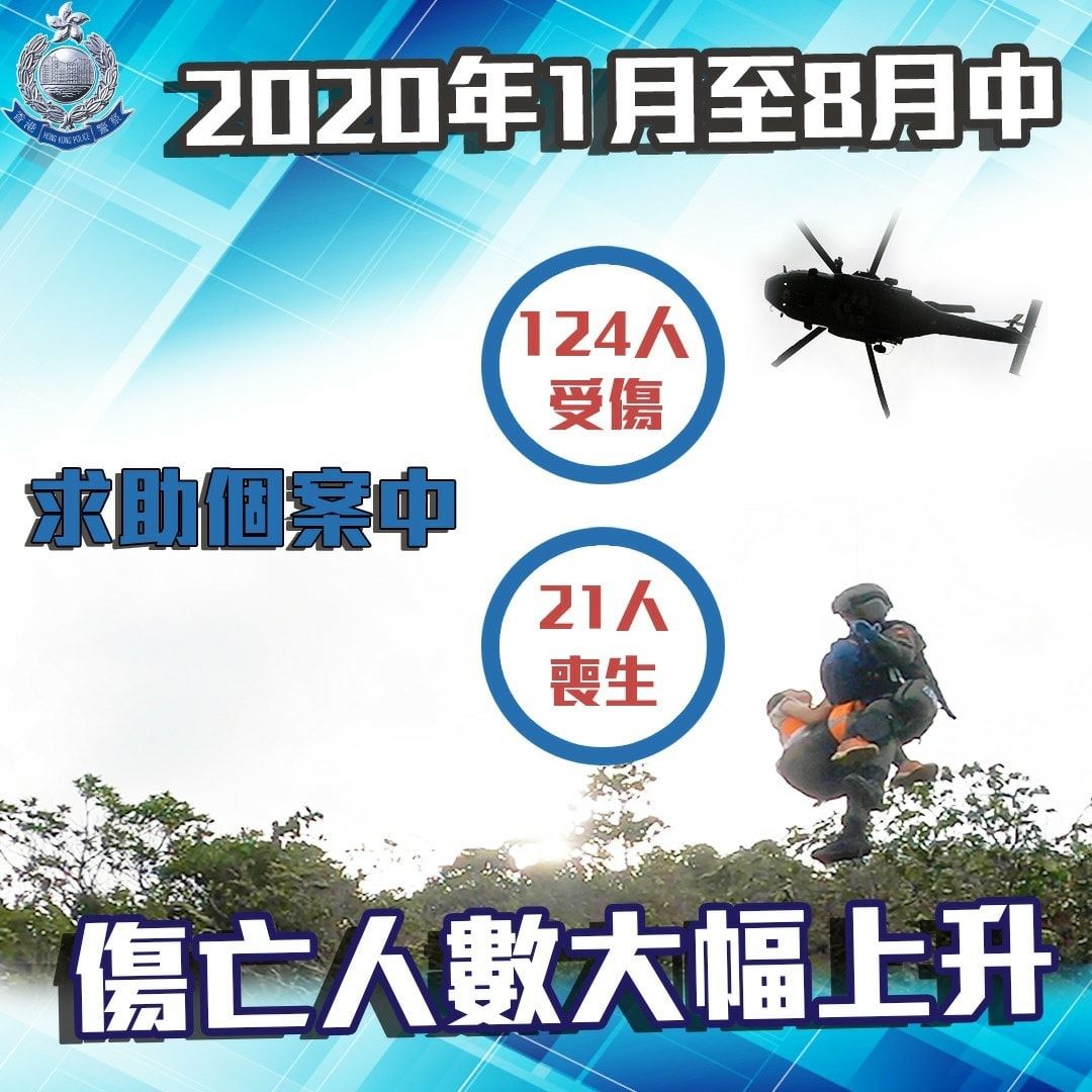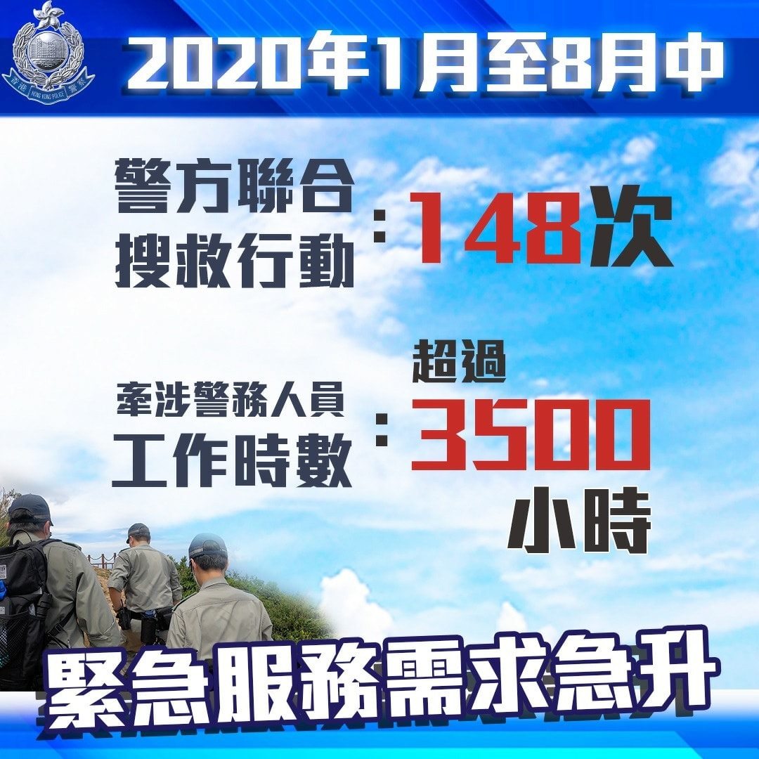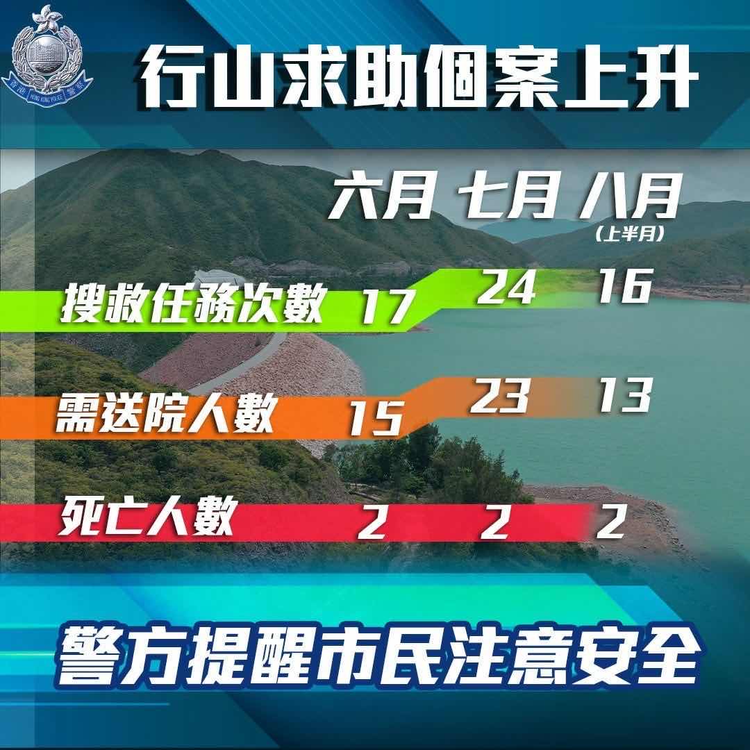 警方在Facebook專頁表示,截至今年8月中,已聯同其他政府部門,包括消防處、政府飛行服務隊及民安隊,一共進行了148次行山搜救任務,涉及130人受傷、21人死亡,其間警務人員的搜索時數超過3500小時。數字自六月至今持續上升,情況令人擔憂。分析求助個案,主要涉及中暑、跌倒、受傷或迷路等。