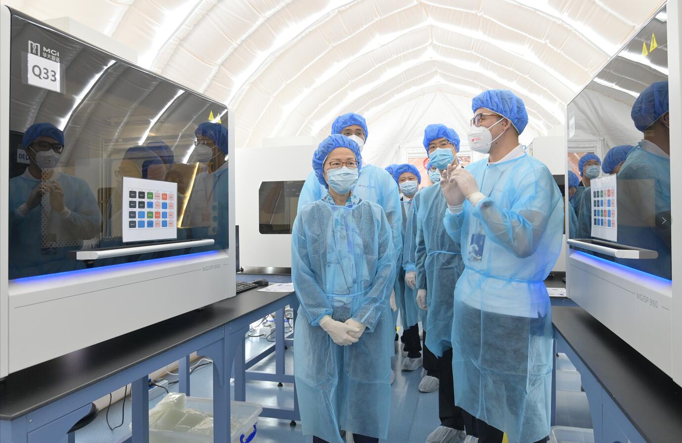 林鄭一行之後視察臨時氣膜實驗室,了解其設備、檢測程序和運作流程。中山紀念公園體育館內共有16個實驗室,是華大基因在港的合資公司華昇診斷中心配合支援隊設置和負責運作。林鄭欣悉經過約兩星期的籌備,實驗室已準備就緒,足以應付大規模檢測。