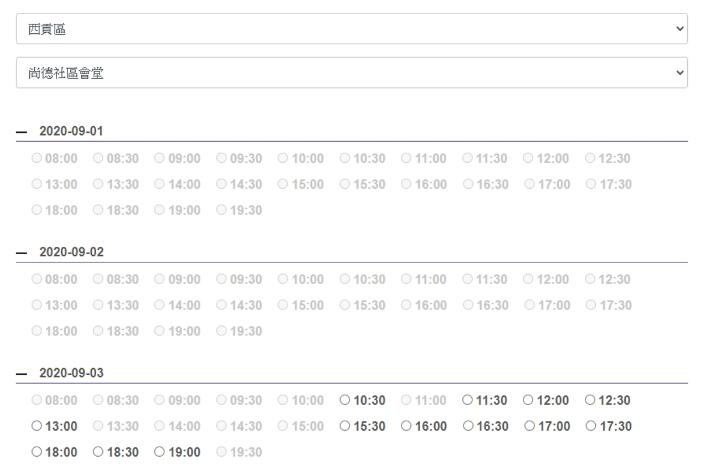 「西貢區尚德社區會堂」檢測中心9月1日及9月2日的所有預約時間均已滿,無法預約。 網貢截圖