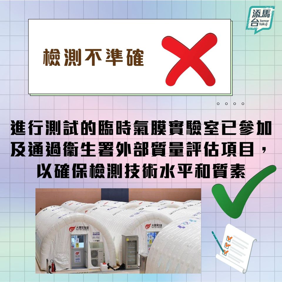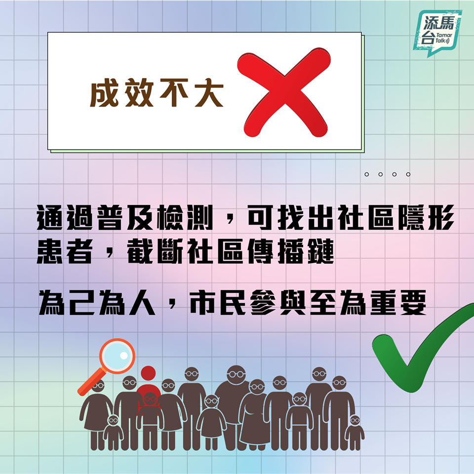 隨著「普及社區檢測計畫」將於9月1日展開,特區政府特地在facebook專頁「添馬台」上,澄清多點有關檢測計畫的謬誤。帖文指出,網上流傳誤導資訊,意圖嚇怕市民而不去參與普及社區檢測計畫。