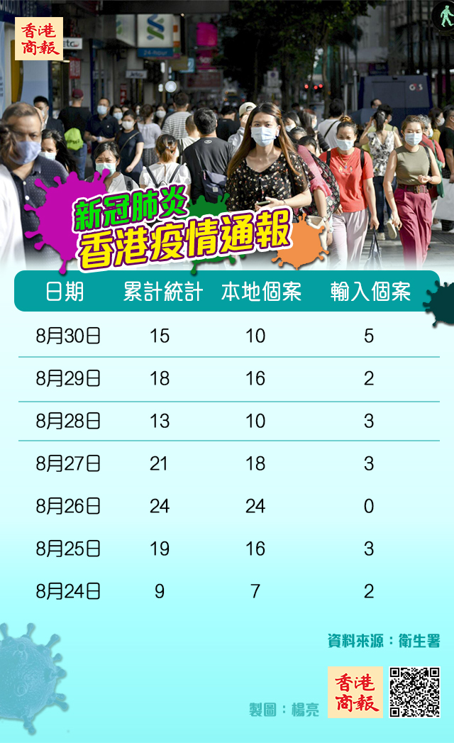 本港第三波新冠肺炎疫情有放緩趨勢,衛生防護中心30日公布新增15宗確診個案,當中5宗輸入個案分別由菲律賓及印度輸入,10宗本地個案中有5宗與早前其他個案相關,另5宗源頭不明,本港累計確診個案達4801宗。另外,屯門醫院急症室接收一名孕婦求診,之後證實她為初步確診者,有10名內科病人被列為密切接觸者須隔離14日。
