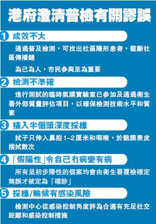 同時,特區政府發布一系列圖片說明以澄清謬誤。當中包括「插入半個頭深度採樣」,實情是拭子只伸入鼻腔1至2厘米和咽喉,於黏膜表皮揩拭數次;「採樣/輪候有感染風險」,實情是檢測中心從感染控制角度評為合適,並有充足社交距離和感染控制措施;「檢測不準確」,實情是進行測試的臨時氣膜實驗室已參加及通過衛生署外部質量評估項目,以確保檢測技術水平和質素。