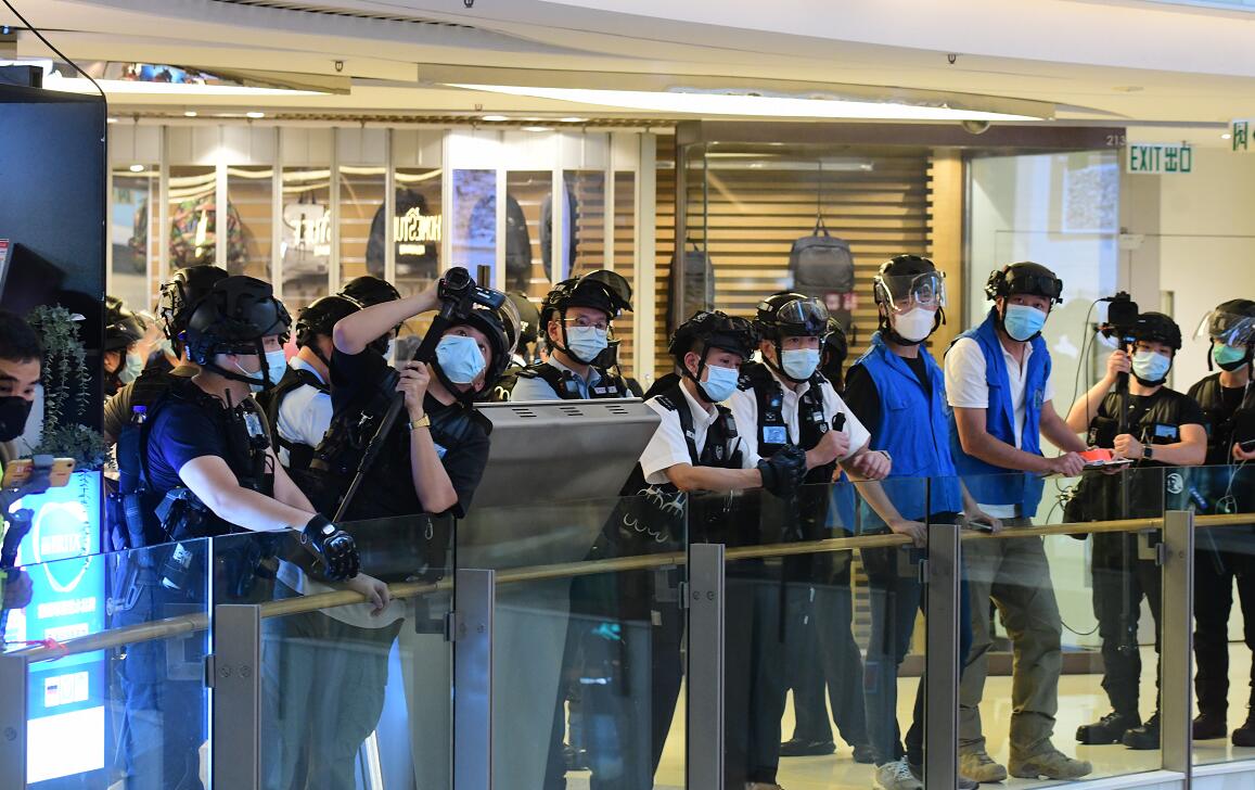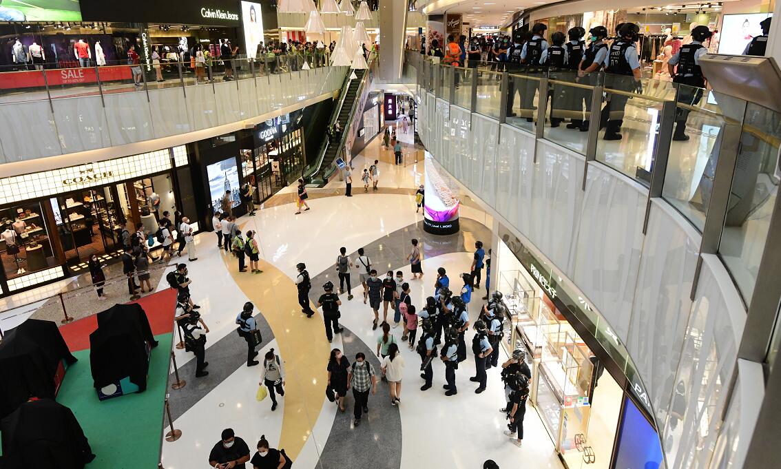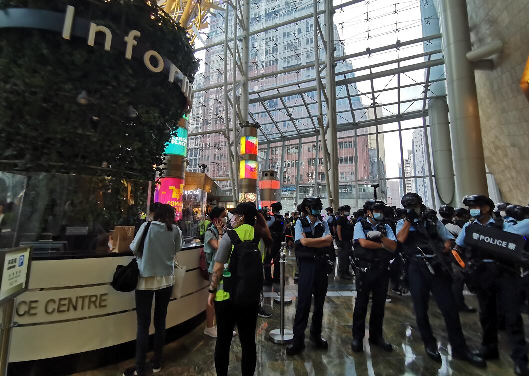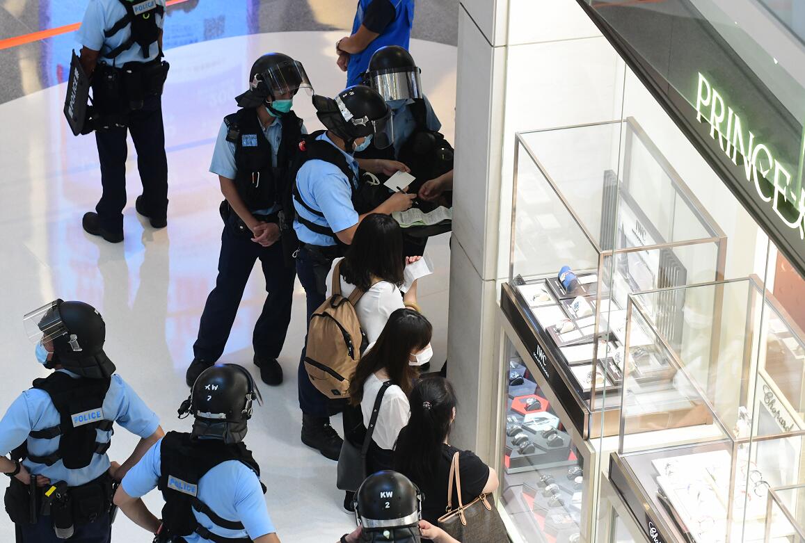 網上有人煽動昨日到旺角兩個商場聚集,大批警員戴上頭盔、部分人手持盾牌及胡椒球槍,進入商場巡邏,警告非法聚集人士不要違反限聚令,期間有商店落閘。警方人員其後拉起橙色封鎖線,截查多名非法聚集人士,並票控他們違反限聚令。
