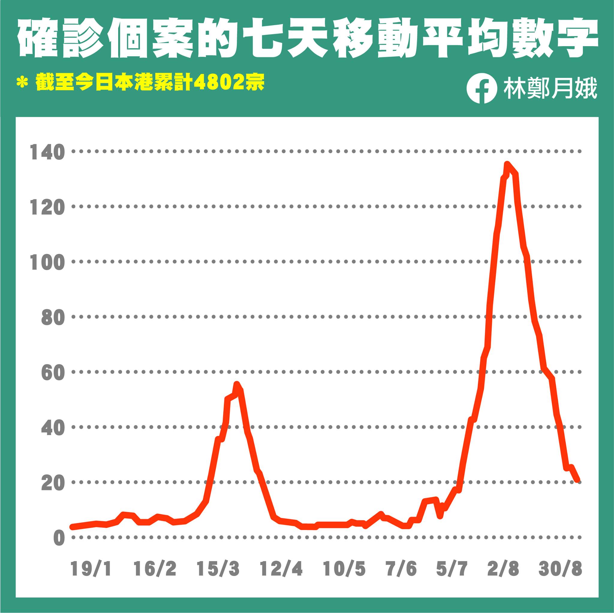林鄭月娥帖文附圖:本港確診的七天移動平均數字。