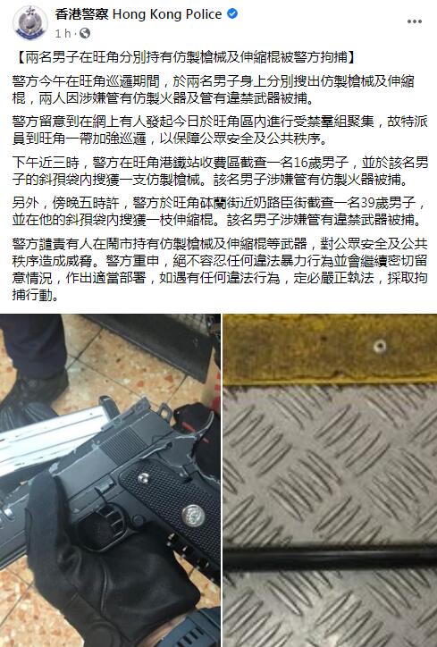警方譴責有人在鬧市持有仿製槍械及伸縮棍等武器,對公眾安全及公共秩序造成威脅。警方重申,絕不容忍任何違法暴力行為並會繼續密切留意情況,作出適當部署,如遇有任何違法行為,定必嚴正執法,採取拘捕行動。