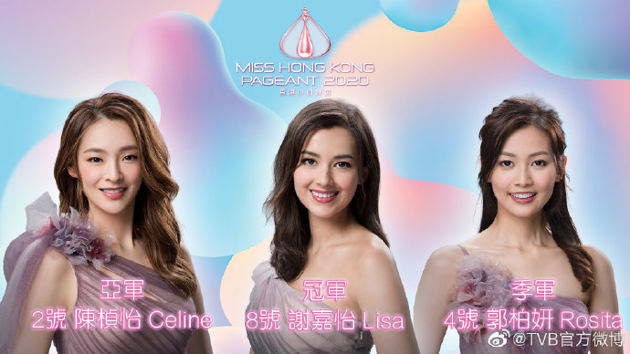 在今晚(8月30日)舉行的2020年香港小姐竞选中,8號谢嘉怡获得冠军,2号陳楨怡获得亚军,4号郭柏妍获得季军。