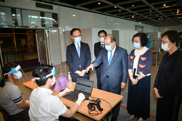 政務司司長張建宗今日(八月三十一日)視察在大會堂設立的社區檢測中心。圖示張建宗(右三)在公務員事務局局長聶德權(左一)和食物及衞生局局長陳肇始教授(右二)陪同下視察社區檢測中心登記處。