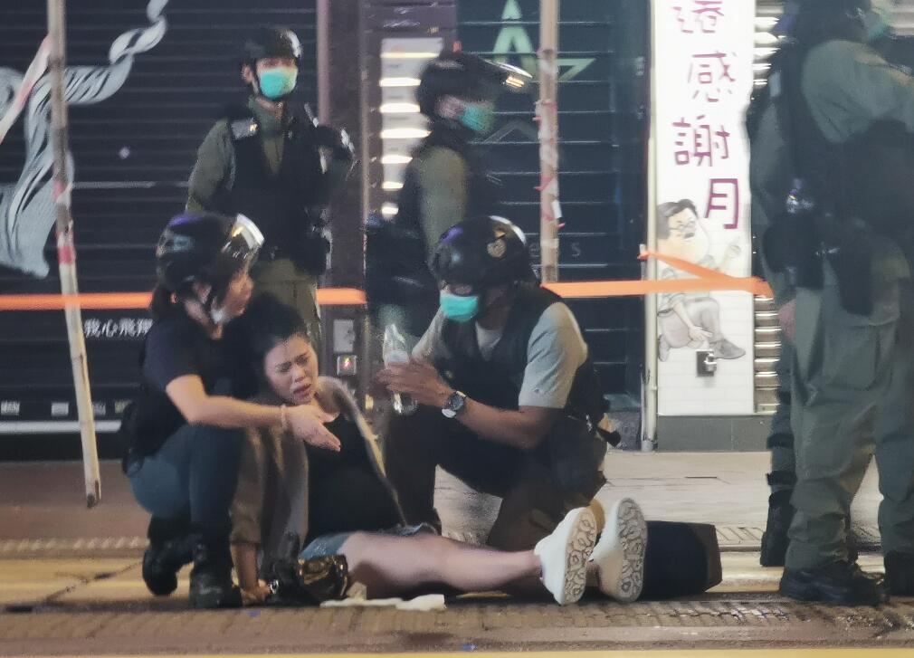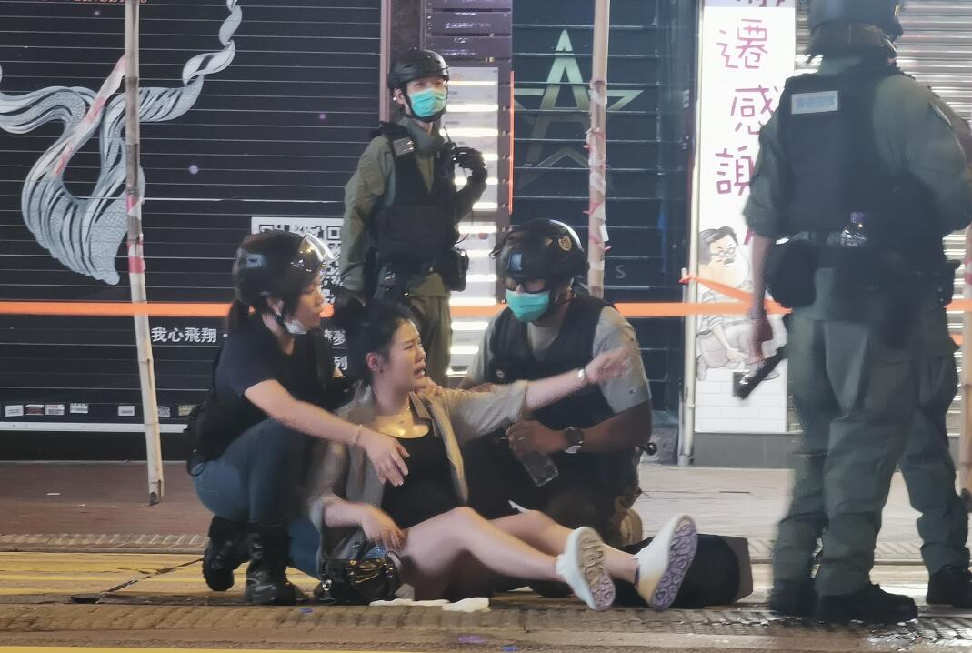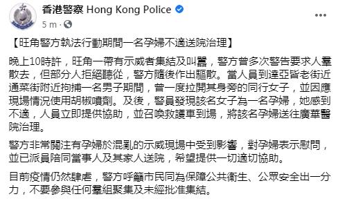 晚上約八時,旺角一帶有人群集結及叫囂,有人一度走出西洋菜南街,並以多個雪糕筒堵塞馬路。現場多人情绪激动,有一位懷孕7個月孕婦摔倒在地,疑中椒流泪,警员上前为其洗眼,最後送醫。有樓上的理髮店员工用鏡子反射光照射樓下警察。