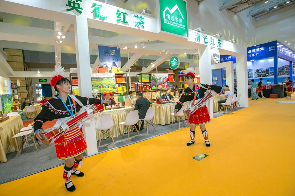 來自廣東清遠連南的茶商在展位前表演瑤族舞蹈。(龍少攝)