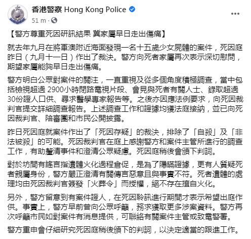 警方今日在社交網站發文指,對於坊間有謠言指遺體火化過程倉促,是為了隱瞞證據,更有人質疑死者親屬身份,警方批有關傳言是惡意及不符事實,指死者遺體的處理是由死因裁判官簽發「火葬令」而授權,絕不存在擅自火化。警方又指,有證人在死因聆訊期間才表示希望出庭作供,再次呼籲市民向警方提供消息。 警方又形容,一直重視及從多個角度積極調查案件,重申會仔細研究死因庭稍後頒下的判詞,以決定適當跟進工作,再次向死者家屬表示深切慰問。