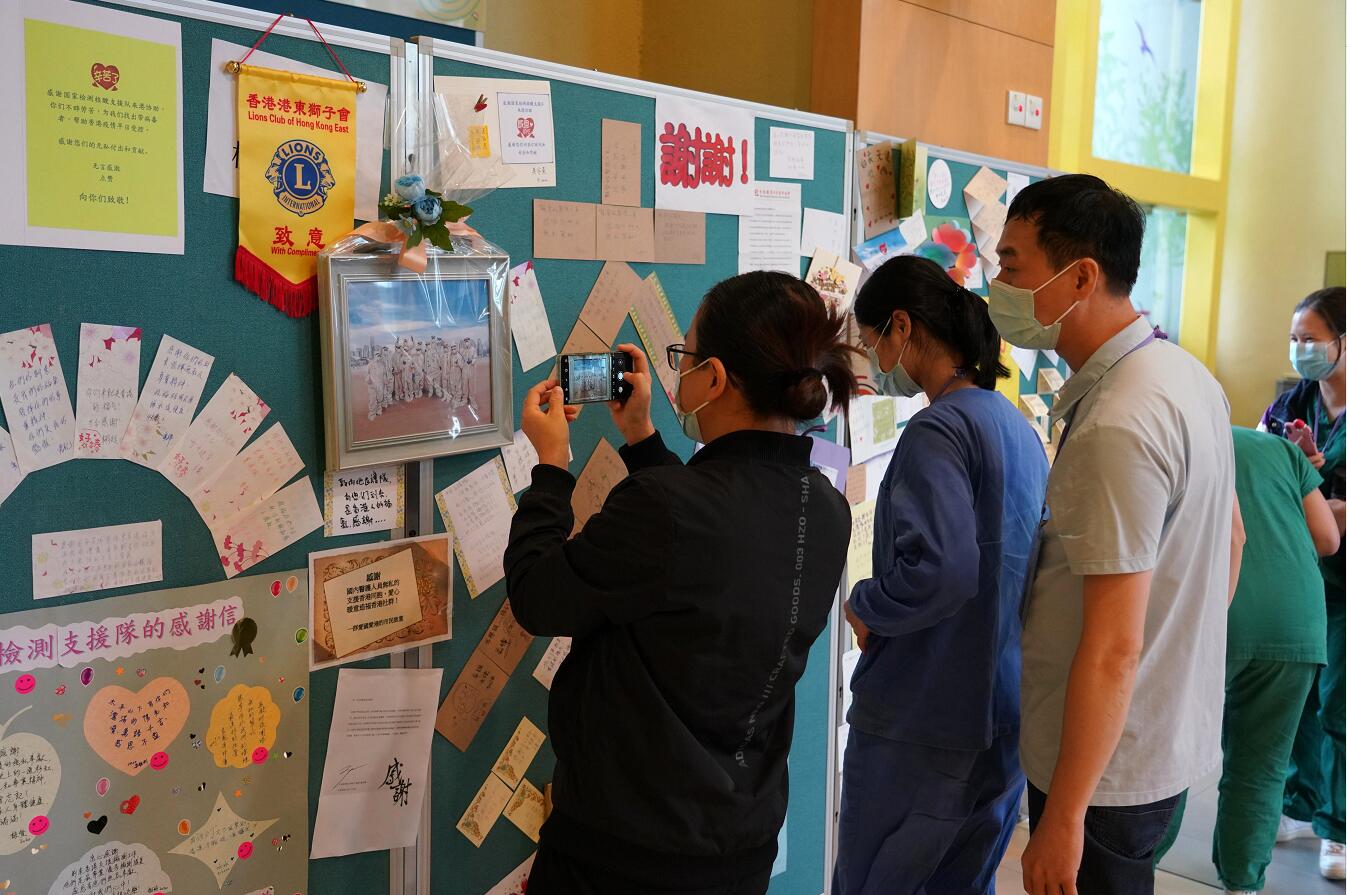 內地支援隊員在臨時休息區觀看香港市民送來的心意卡。