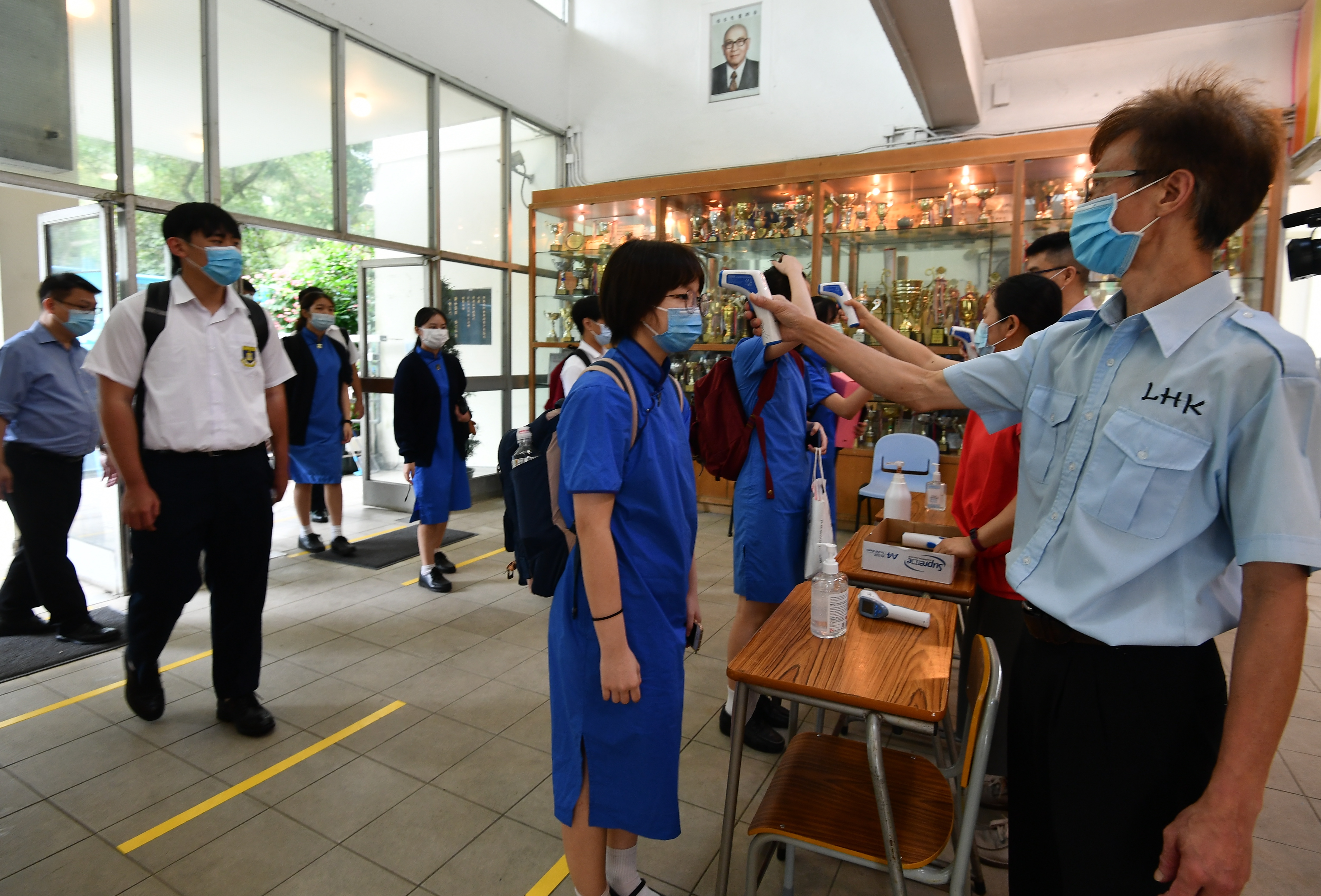 教育局對即將回校上課師生接受強制檢測未有定案。圖為今年6月份中三至中五跨境學生短暫復課,於進入校門前先量度體溫。